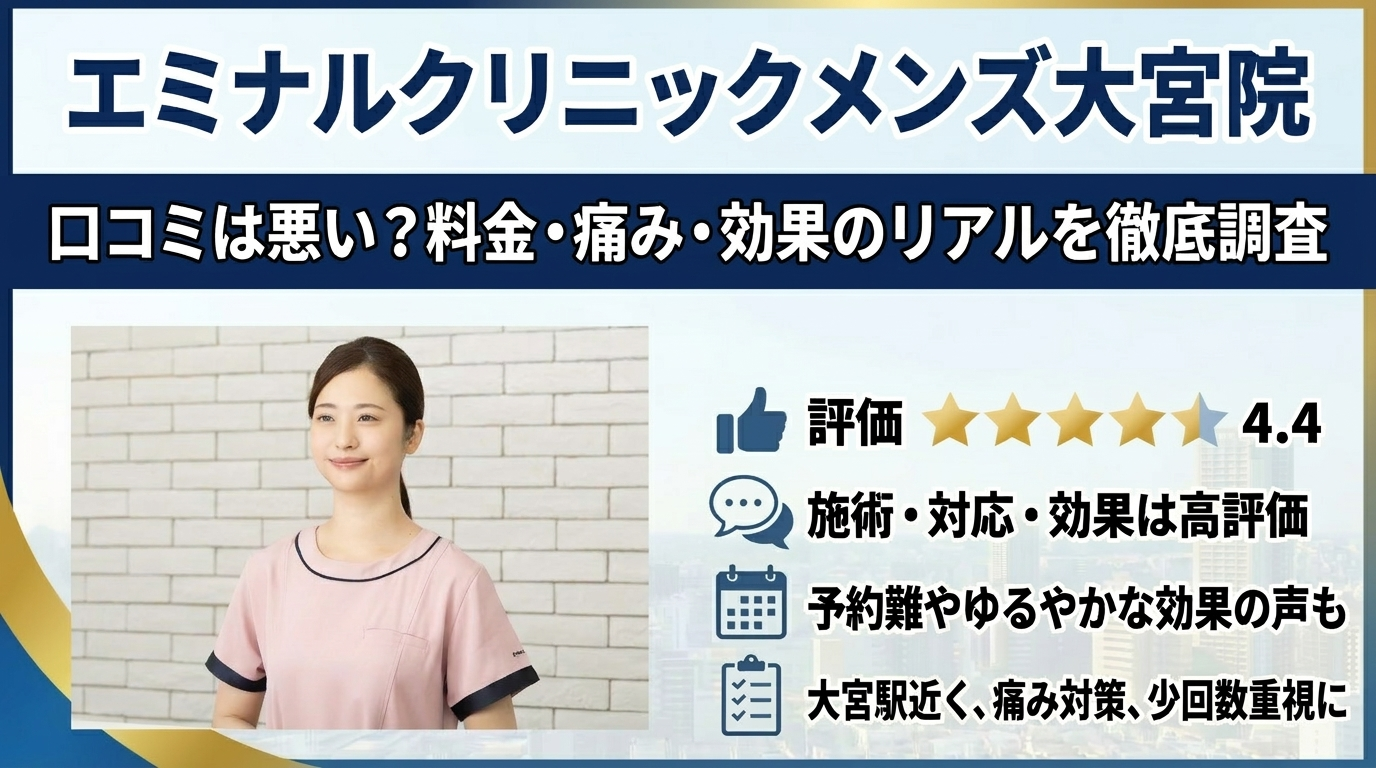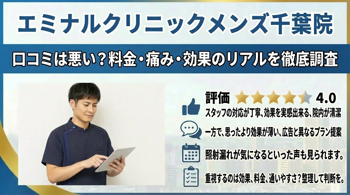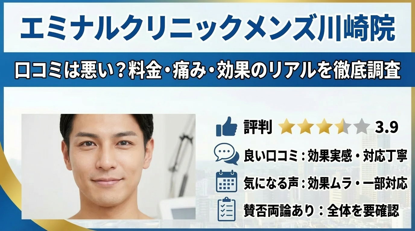 エミナルクリニックメンズ町田院の口コミは、全体として効果実感・スタッフ対応・院内の清潔感・通いやすさなどが評価されやすい一方、広告で受けた印象と案内内容の差/プラン提案の受け取り方/カウンセリング対応との相性が不満になりやすい傾向でした。